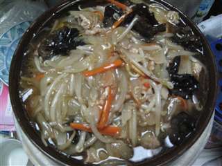 モヤシとか、きくらげが入っていてあんかけになってる具が上に
